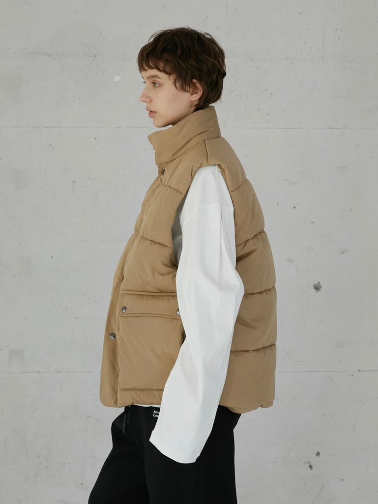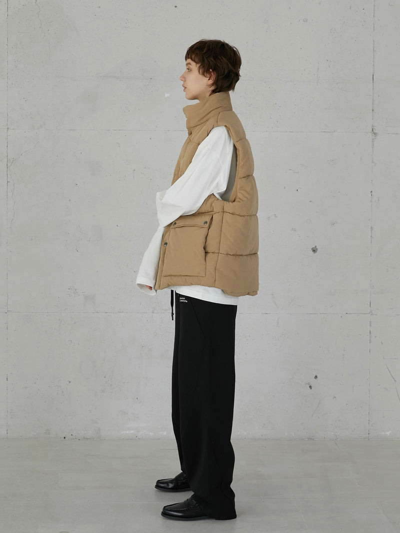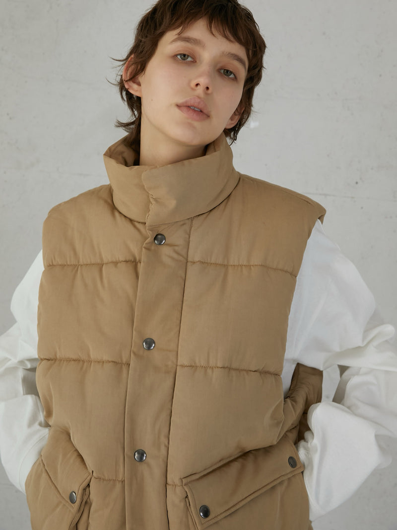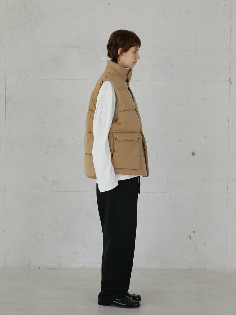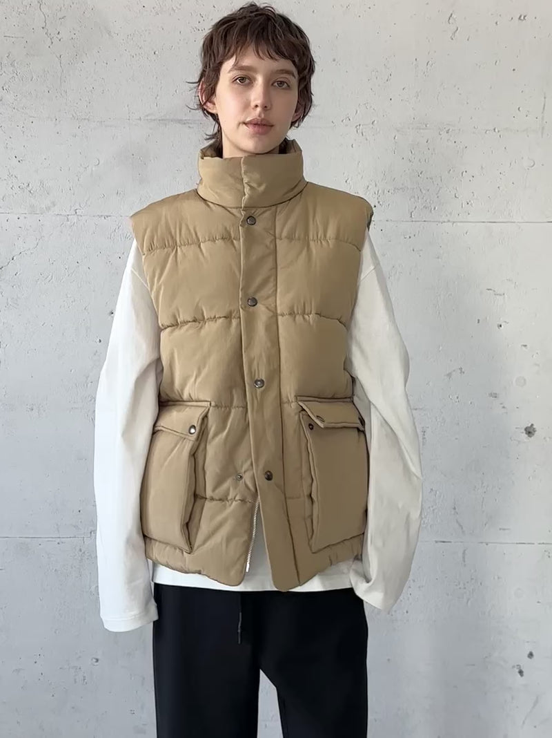 ボリュームのある中綿を搭載した、軽量かつ保温性にも優れた中綿ベスト。フロントにはフラップの上側からとサイドからのポケットの二重ポケットを。中綿入りの立体的なポケットを配置しました。