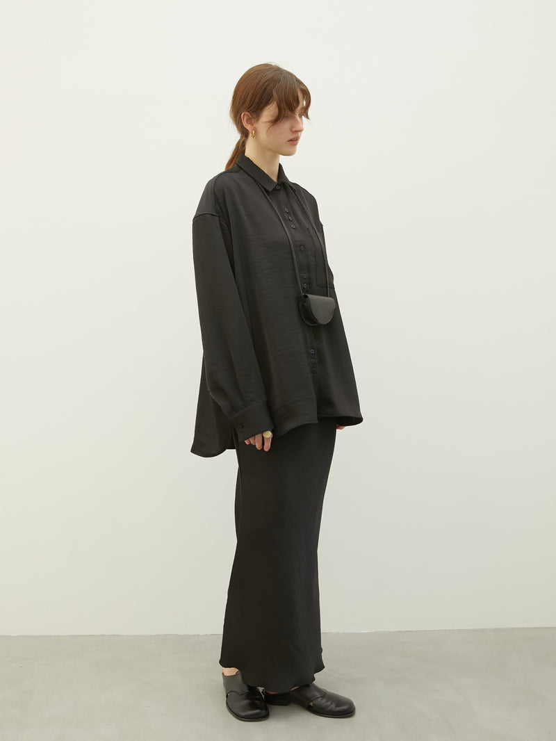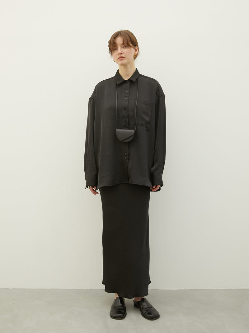 無駄な装飾を一切削ぎ落とした、潔いほどにシンプルでミニマムなサテンスカート。セットアップで着用することで、ドレスのような気品漂うワンカラーコーディネートが完成します。