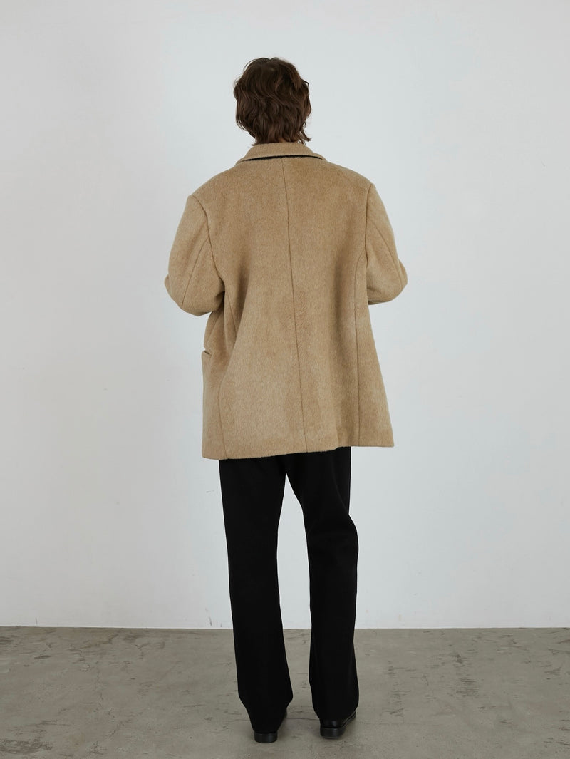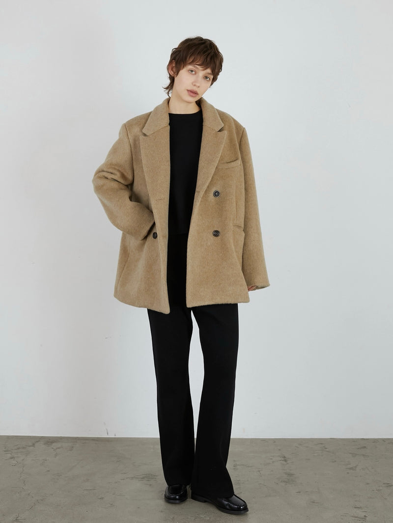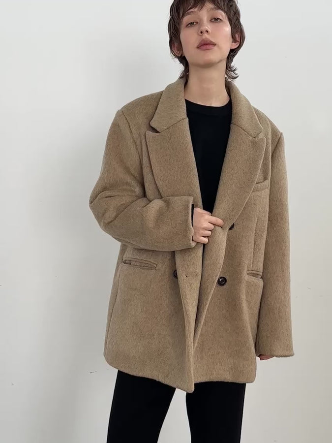 昨年のジャケットコートをブラッシュアップしてメンズライクでモードなデザインに仕上げました。シルエットはオーバーサイズで直線ラインのバランスにこだわった一着。