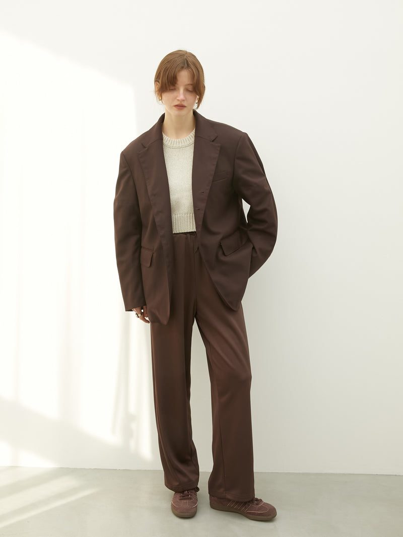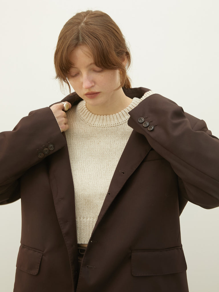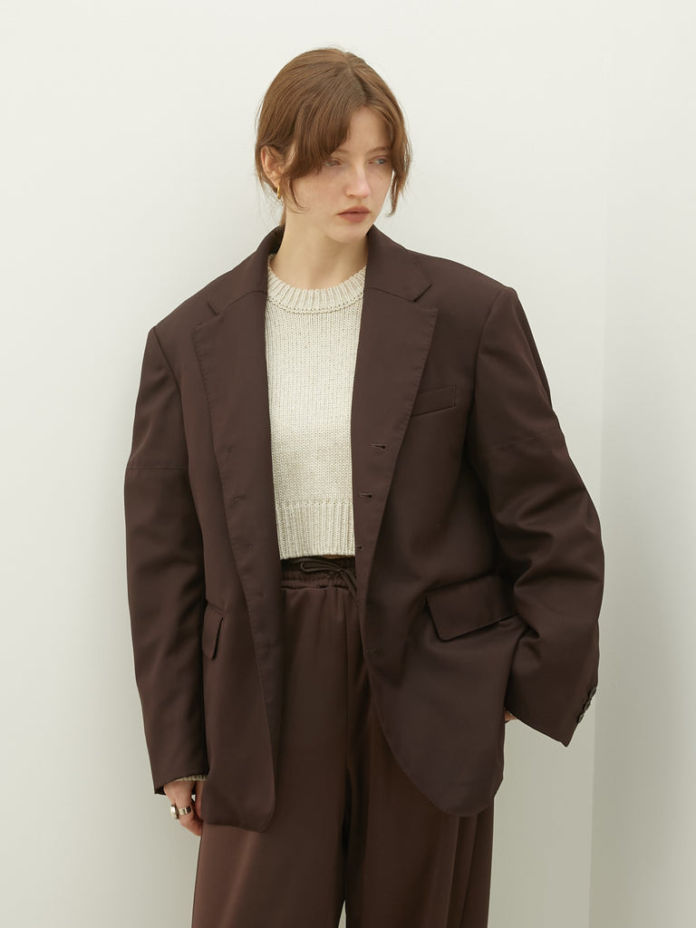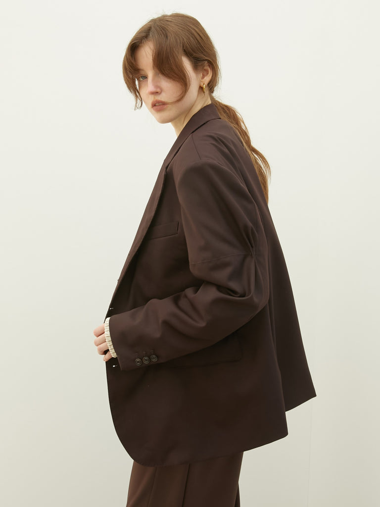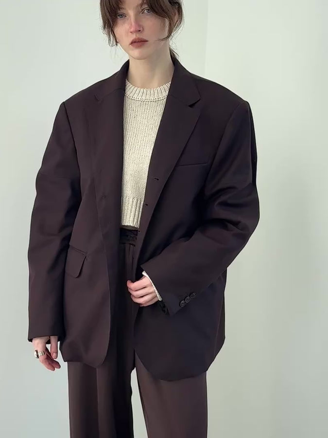 圧倒的な存在感を放つ洗練されたオーバーシルエットのテーラードジャケット。最大のこだわりは、ウールを47%配合した贅沢な生地感。ウールならではのしっかりとしたハリとコシが、大胆なビッグシルエットを崩すことなく立体的に保ち、袖を通した瞬間に仕立ての良さと高級感を感じていただけます。