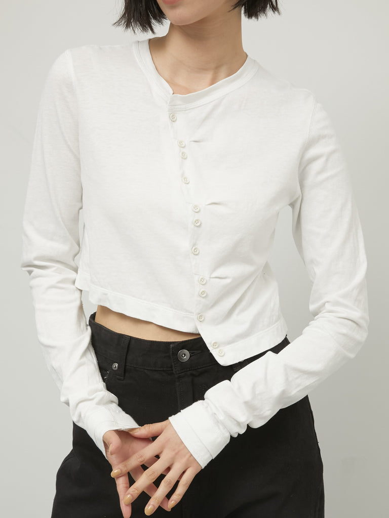 斜めにカットしたフロントとボタンディテールがアクセントになり、シンプルながらもモード感のある一枚に。