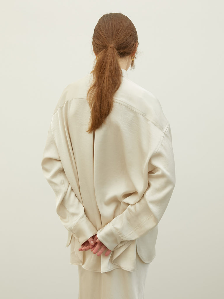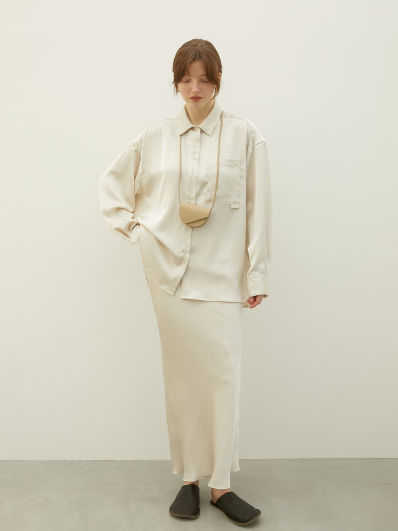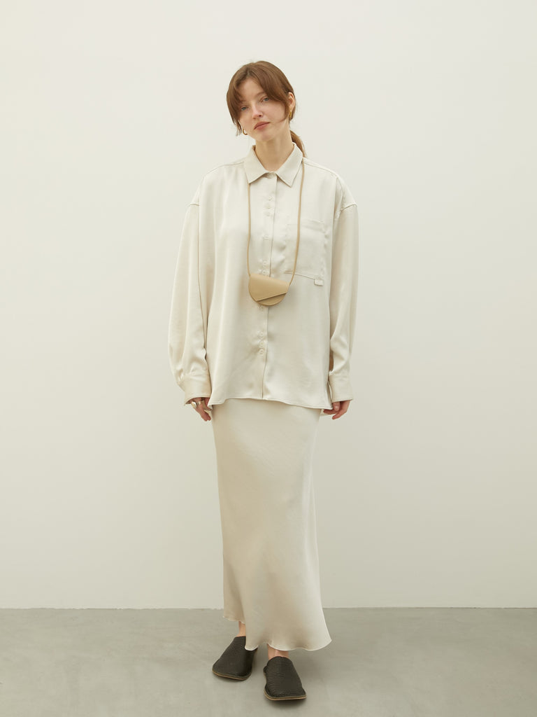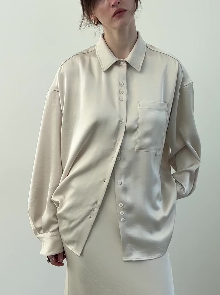 美しい光沢を放ちながらも日常使いしやすい適度な厚みを持たせたサテンシャツ。サテン特有のテカリを抑えた上品な質感は、洗練された大人の雰囲気を演出してくれます。気になるお尻周りまでしっかりと隠れる着丈に設定。体型をカバーしつつ、リラックス感のあるモードな着こなしを叶えます。