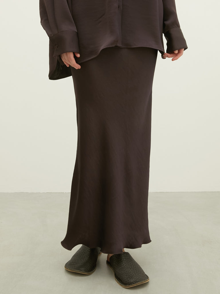 無駄な装飾を一切削ぎ落とした、潔いほどにシンプルでミニマムなサテンスカート。セットアップで着用することで、ドレスのような気品漂うワンカラーコーディネートが完成します。