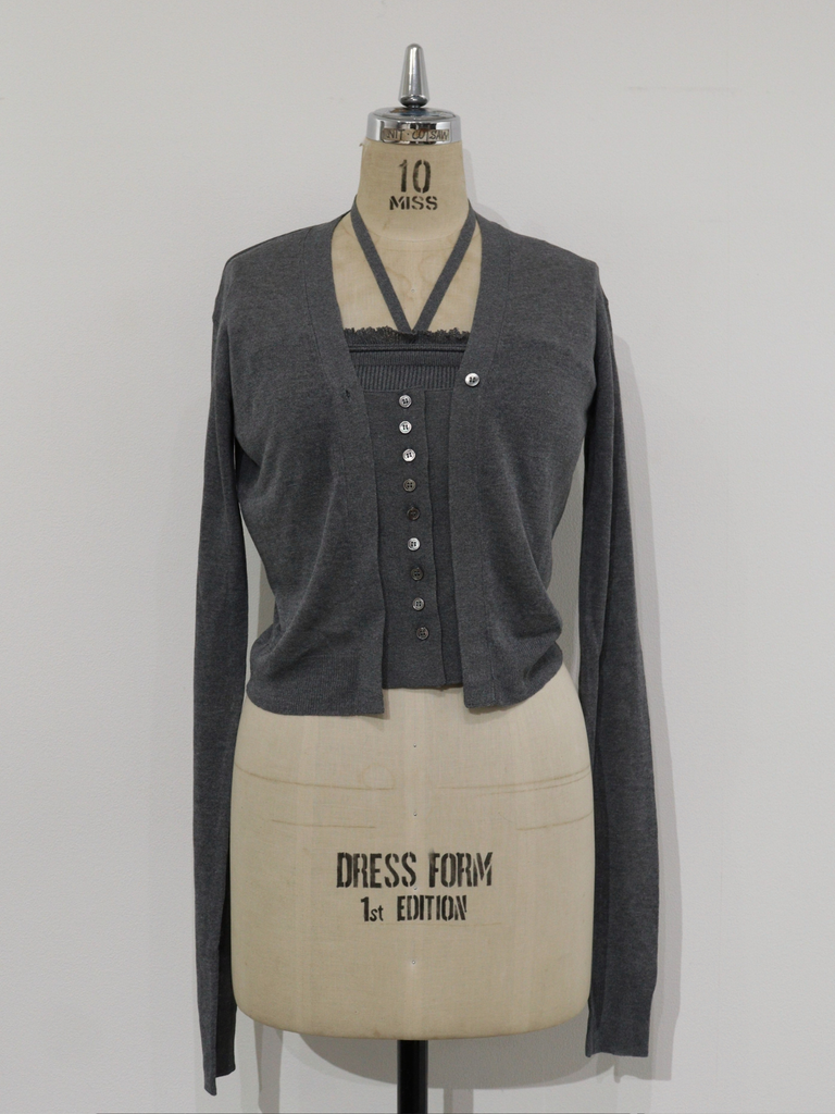繊細な透け感のハイゲージカーディガンと、ホルターネック仕様になるブラトップがセットになったアンサンブルアイテム。