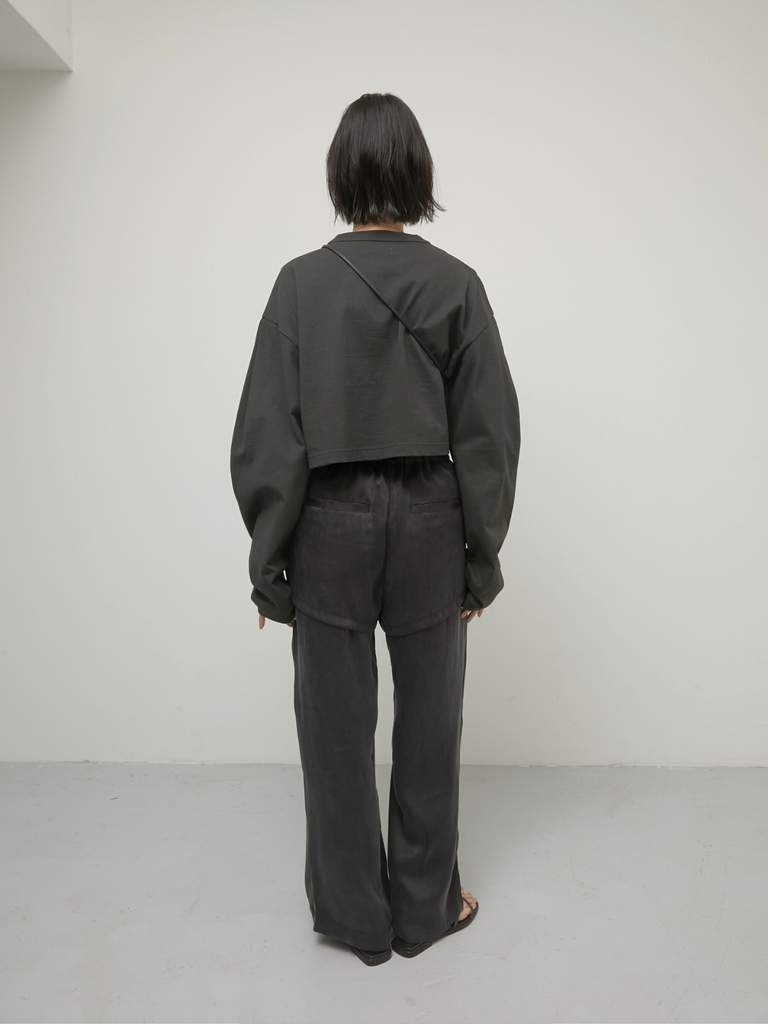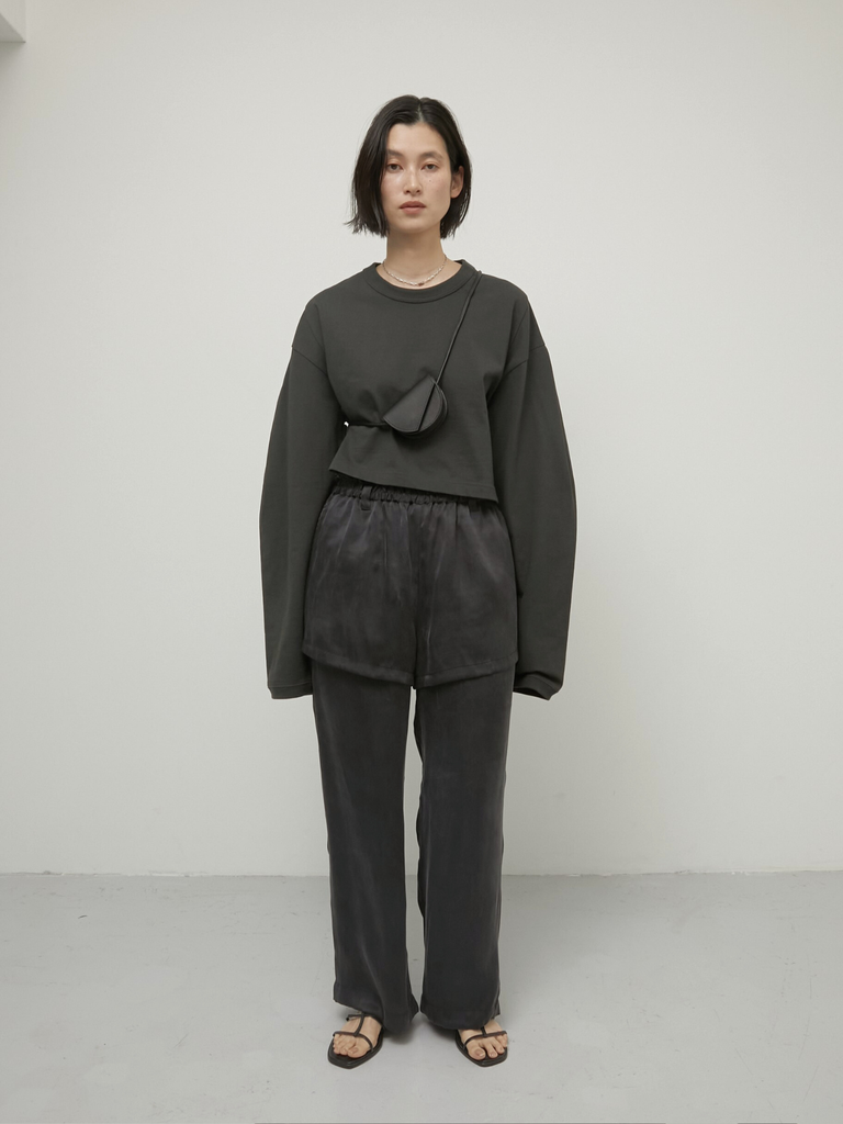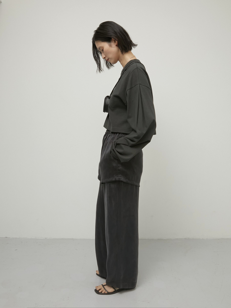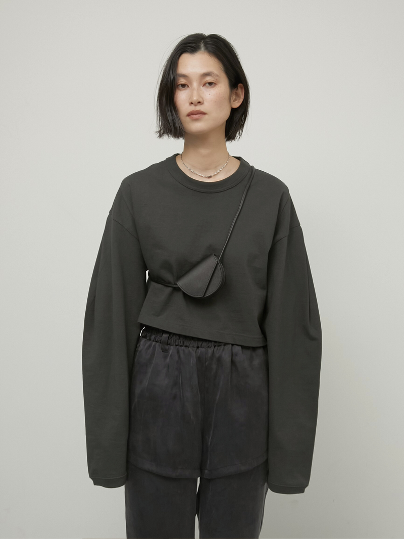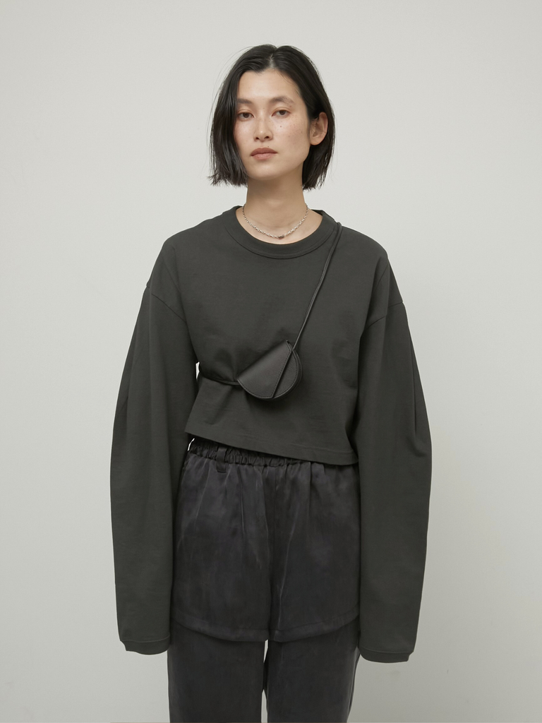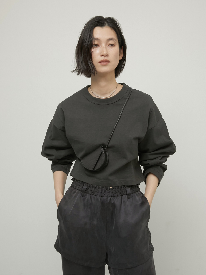 無駄を削ぎ落としたデザインに計算されたバランスのロンTはほどよくハリのある上質なコットン素材を使用し、袖タックで立体感のあるフォルムを実現しました。コンパクトな着丈がウエスト位置を高く見せ、ワイドパンツやボリュームボトムとも相性◎袖が長めなのもかわいいポイント。