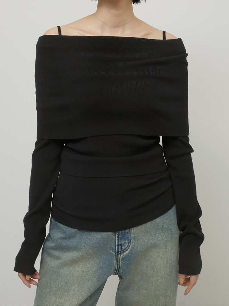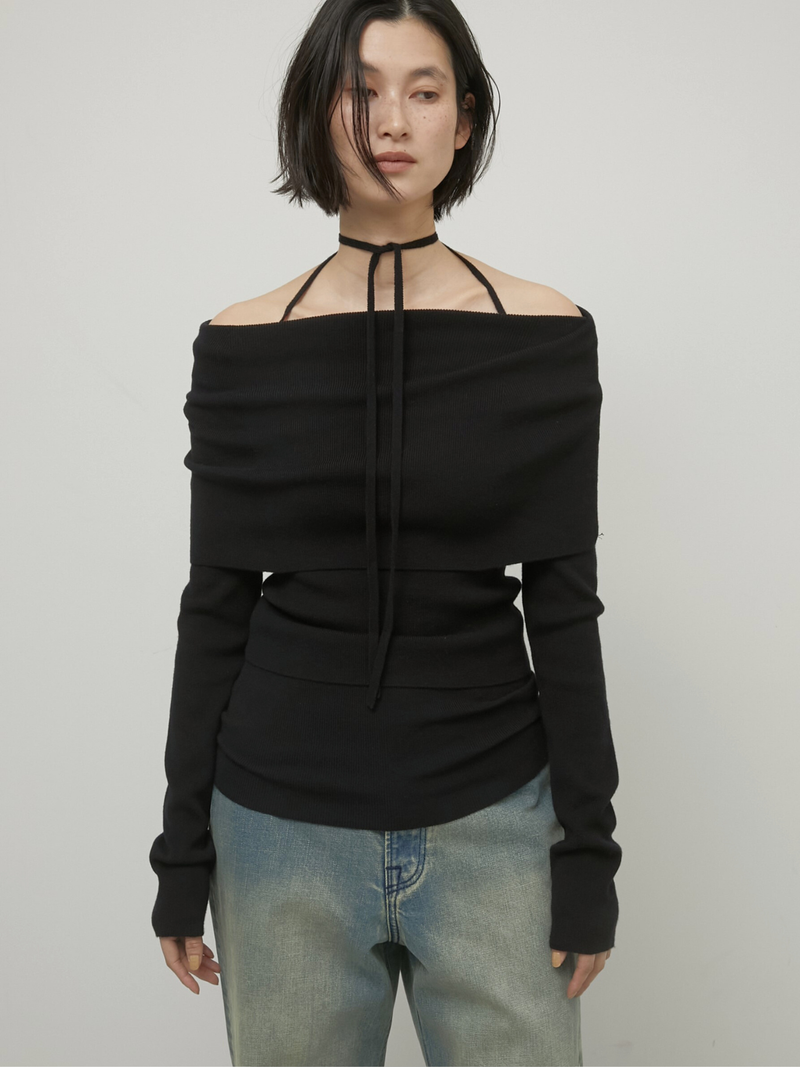 コード使いがGEMらしいオフショルダーニット。ワイドに折り返したネックラインが肩まわりを華奢に演出し抜け感のあるスタイリングを叶えます。同生地のニットキャミソールがセットになっているので、キャミソール単体での着用はもちろん、肩紐をアレンジしてチョーカーのようにアレンジが可能。肩の出し方も調整いただけるので気分やスタイリングに合わせて様々な着方を楽しめる一着です。